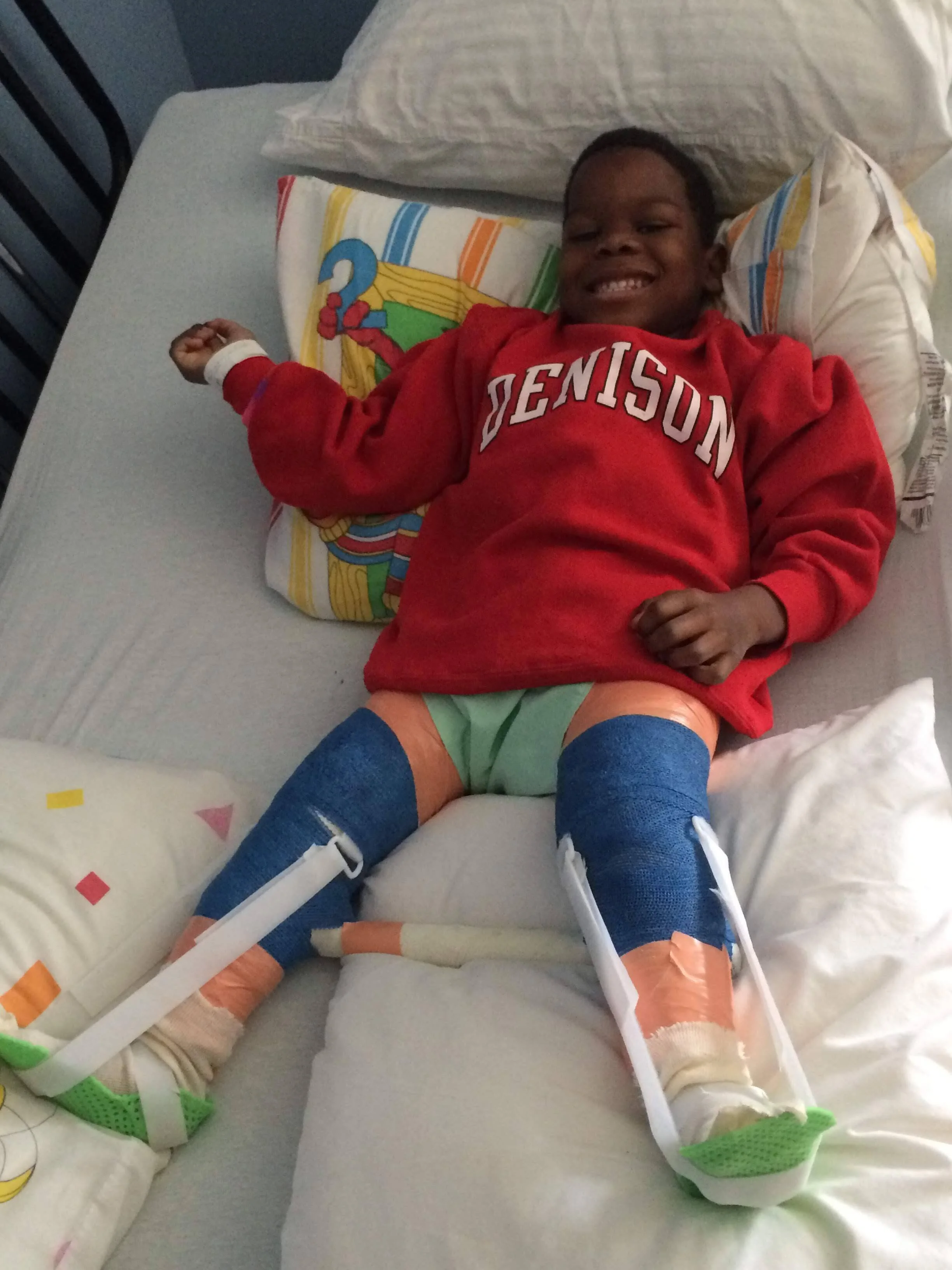 In 2014, just after Carl turned 4 years old, he traveled to Canada to be examined by the excellent orthopedic surgical staff at the Shriners Hospital for Children. In Montreal Carl was diagnosed with a muscular skeletal condition called here arthrogyrposis. In Carl’s case this meant his hips knees and ankles were fused and he lacked muscle mass in his legs.